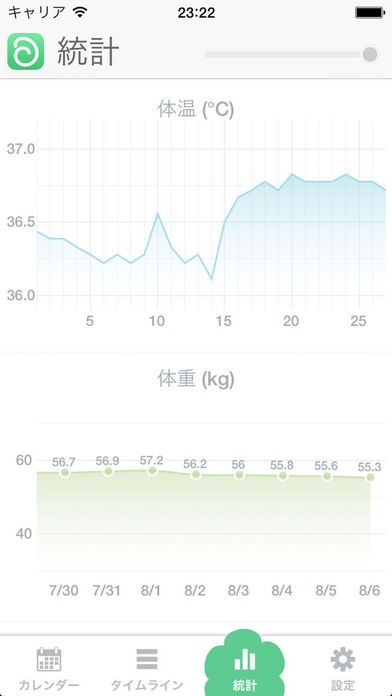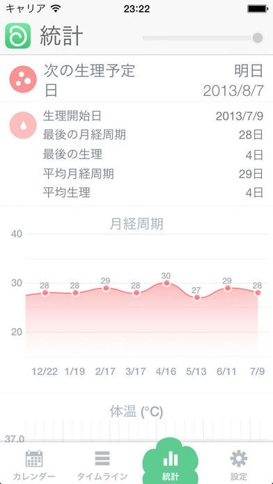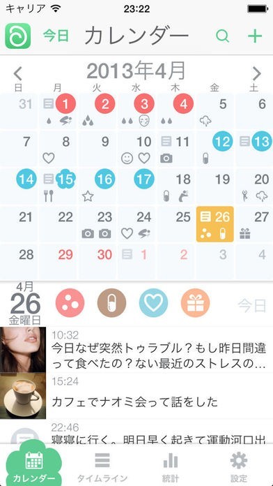 生理が来た日を記録すると同時に、その日の体温や体重、写真やメモを記録することができるようになっています。各種データはグラフ化され、詳細に管理することができます。女性の毎日の暮らしをサポートするカレンダーとなっています。