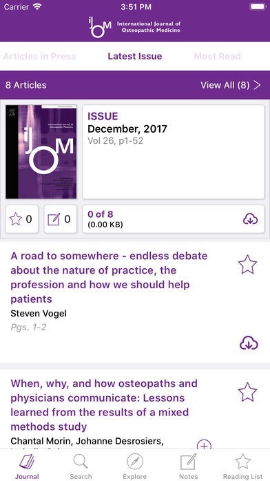 Now it’s easy to stay current with the diagnosis, treatment and management of patients with neuromusculoskeletal disorders and somatic dysfunction. The International Journal of Osteopathic Medicine app brings you the convenience of reading your favorite journal from anywhere in the world with just a tap. Now available for both iPad and iPhone!