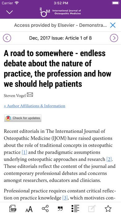 Journal subscribers: Log in with the same username and password that grants you access to the full journal content on the International Journal of Osteopathic Medicine website. These credentials will allow full access to all content on the app.
