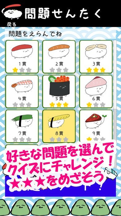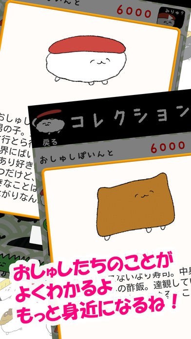 App Storeより引用ゆるくてシュールな世界観の「おしゅしだよ」のキャラクターと寿司ネタの漢字の読み方をおぼえよう。