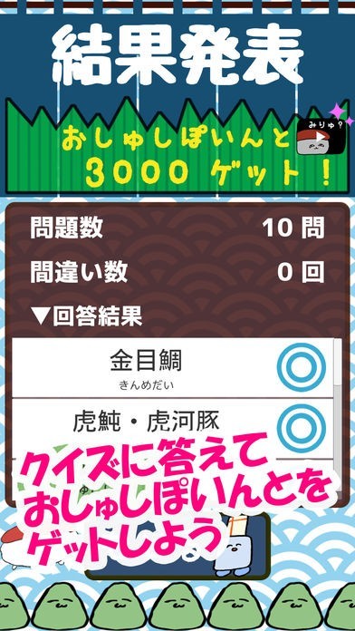 クイズで遊ぶと「おしゅしぽいんと」をゲットできるぞ!