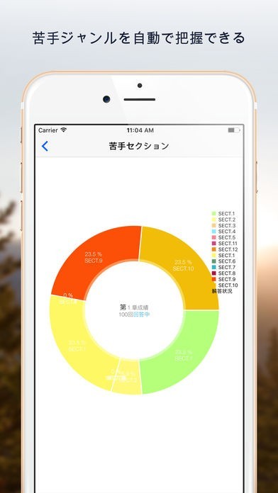 回答結果はグラフで表示されます。どの分野が弱いのか一目瞭然です。自分の苦手分野が把握できるので、今後の学習に役立ちます。苦手分野を重点的に勉強して試験対策を行いましょう。