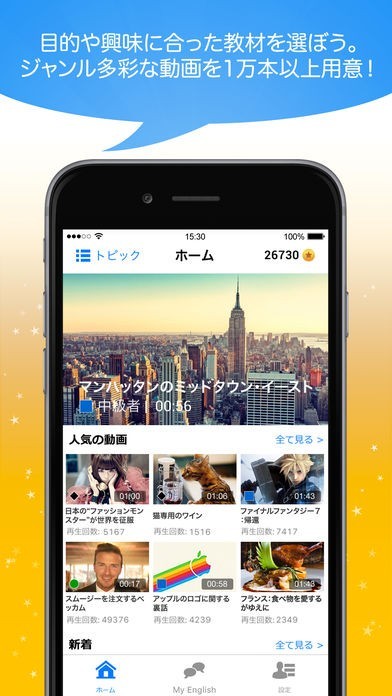 無料で様々な英語学習ができるアプリです。毎日配信される動画では、楽しみながら英語力を身に付けることができます。またリスニングやスピーキングに対応した内容も組み込まれています。