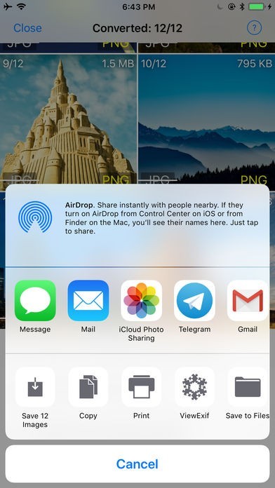 変換された画像ファイルはまとめて電子メールで送信したり、SNSでシェアしたり、iTunesでファイル共有できます。iTunesのファイル共有でパソコンへのバックアップもスムーズに行えます。
