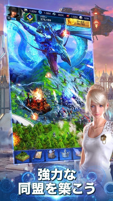 ファイナルファンタジー15:新たなる王国は、武井咲さんがテレビCMをやっている事でも有名なシリーズ最大のオープンワールドを誇るロールプレイングゲームです。 ファイナルファンタジー15のキャラクターが出てくるモバイル向けのゲームで、自分だけの王国を作って強力魔法を入手していきます。 ギルドを組んでフレンドと冒険できる機能もあり、リアルタイムに全国の友達と遊べるのもポイント高いですね。 部隊を作り上げてアクションリアルタイムバトルで、勝利目指して頭を使うのも楽しいです。 ノクティス、シドニーやルナフレーナといったオリジナルで人気のあるキャラクターももちろん出てきますので、オリジナルファンも満足できる内容です。