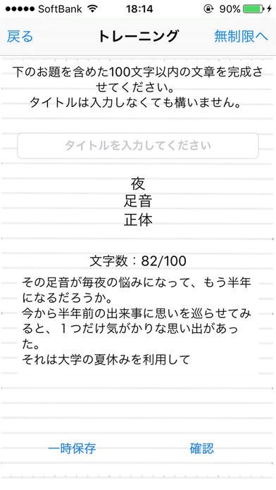 このアプリを使用すればストーリーを作る能力をトレーニングできます。初めに3つのお題が表示されるので、それらのキーワードを組み合わせて一つのストーリーを作ります。この繰り返しによって話を作る能力を磨こうというアプリなのです。自分一人の場合は文字数を制限したり、制限時間を設けることでより緊張感を持って訓練が可能です。また、3人で協力してストーリーを作成することもできます。作成したストーリーは保存して後から見返すことができます。