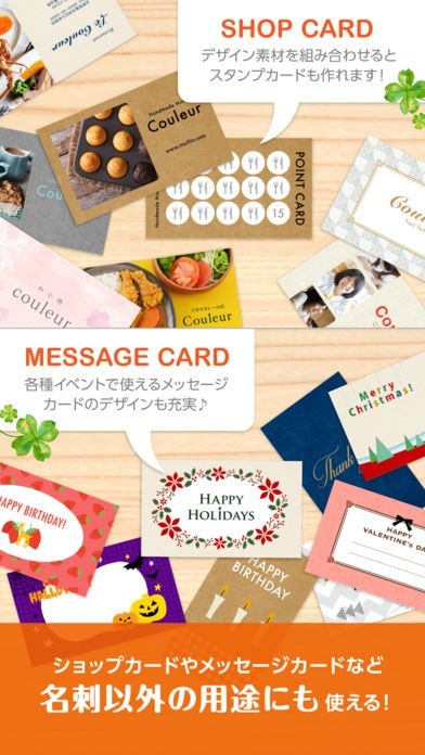 「ショップカード」や「メッセージカード」などに使える背景やフレームも内蔵。自由に組み合わせて名刺以外のカードも作れます。