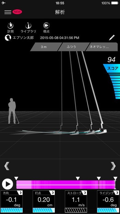 - パッティング軌跡: パッティングのストロークを詳細に表示。フォロースルーまで詳細に表示され、360度どの方向からも自分のストロークを確認することができます。