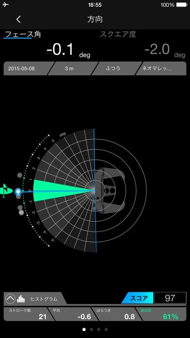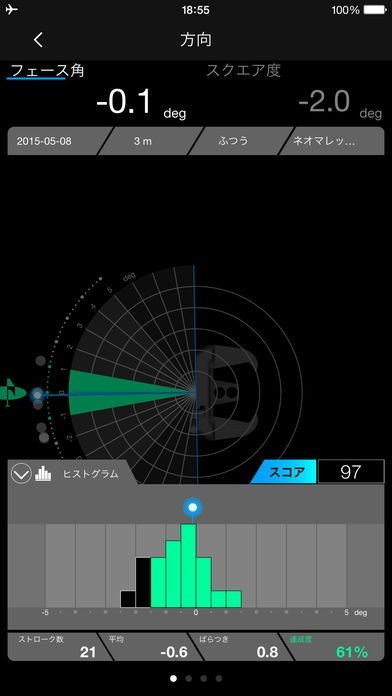 - ストローク解析: あなたの知らないパッティングのヘッドスピード・バックストロークの幅を正確に解析します。ターゲット距離に対して安定したストロークでパッティングすることで、より再現性の高いパッティングを実現できます。