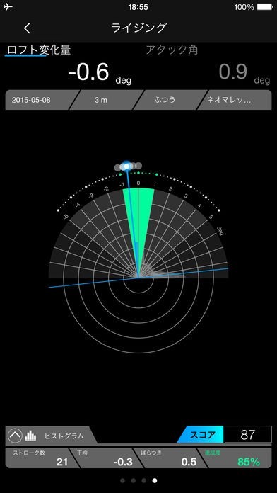 パッティングにおいておさえるべきポイントを点数化しました。さらに総合スコア機能によりあなたのパッティングを評価します。80点以上をコンスタントに実現させる練習をすることで、より効率的な上達が可能となります。