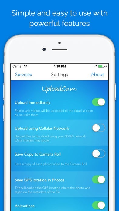 「UploadCam」ではワンドライブ、ドロップボックス、グーグルドライブにログインしておくことで、写真や動画を撮った場合に自動的にそれらの場所に送られます。 よって、スマートフォンが壊れてしまった場合でもしっかりといつでもバックアップをとってくれます。 また、すでにスマホ内に存在しているものもアップロードすることも出来たりもします。 他にも設定によって、位置情報を付与するかどうかや、アニメーション効果が必要あるのかなどを変えることができます。
