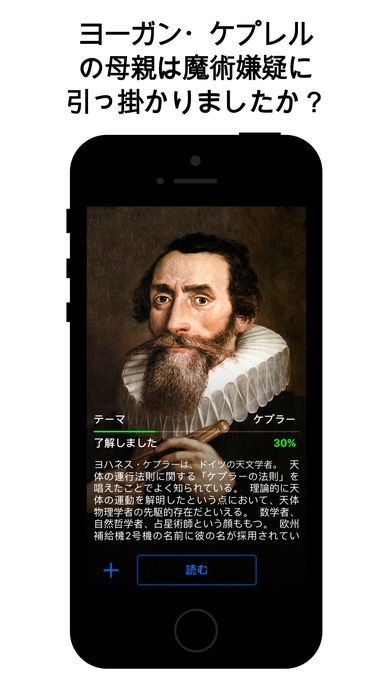 ケプラーについての詳しいエピソードを読むことができます。彼が発見した法則だけではなく、彼に関わった人物、人生で起こった出来事などがわかります。色々な観点からケプラーのことを学べるアプリです。