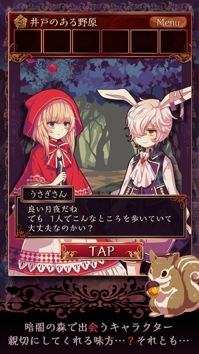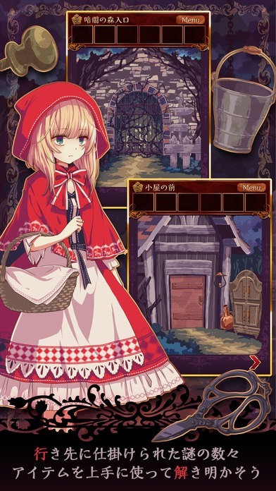 美麗なグラフィックで「赤ずきん」の童話を体験できるアドベンチャーゲーム「脱出ゲーム 赤ずきん~暗闇の森からの脱出~」 可愛い赤ずきんを操作して、暗闇の森からの脱出を目指すことができます。 自分の行動によってエンディングが変化するマルチエンディング方式を採用しており、何度でも挑戦したくなるのも嬉しいポイント。 怪しい場所をタップして探索し、発見したアイテムやカードを組み合わせて、新たなアイテムを入手しましょう。 困った時に助けてくれるヒントボタンも搭載。 ヒントボタンでヒントを閲覧しながら、全ステージクリアを目指せるようになっています。