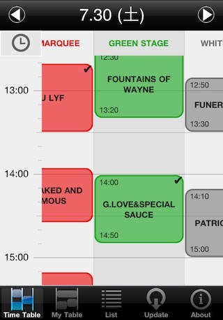 「FRF11TT」は、フジロックフェスティバル2011専用アプリです。 非公式タイムテーブルアプリとして、ステージごとの出演者情報や出演時間などを掲載。 複数のステージを見やすい一覧で表示してくれるため、見逃せない出演者のチェックも手軽に行うことができるでしょう。 マイテーブル機能を用意しており、お気に入りの出演者や見たいステージを選択して自分だけのタイムテーブルが作れるようになっています。 また、タイムテーブルの自動スクロール機能も搭載。 長い一覧表も現在時刻に合わせて楽々自動スクロールが行えます。