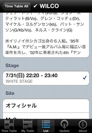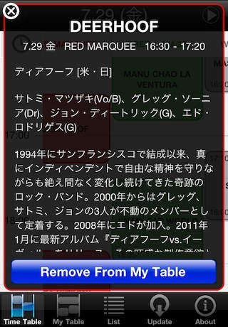 フジロックフェスティバル2011専用アプリ「FRF11TT」では、便利なタイムテーブル機能を搭載しています。メインステージはもちろんのこと、サブステージも表示可能。各ステージの開始時間や出演者を見やすく表示してくれるため、優先して廻りたいライブのチェックにも活躍してくれるでしょう。マイテーブル機能も用意されており、自分だけのタイムテーブルが作成できるのも便利なポイントです。お気に入りの出演者や見逃せないライブはマイテーブルに追加して、スケジュールの管理が行えます。また、出演者情報の表示機能も充実。気になる出演者がいないか確認してみてはいかがでしょうか。