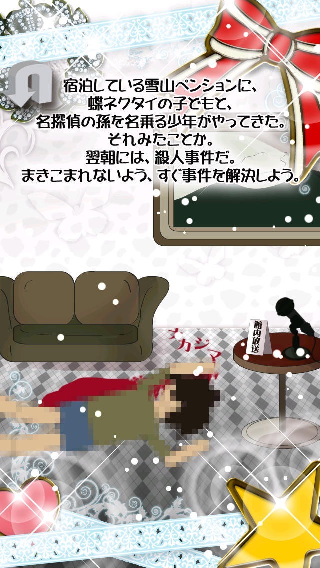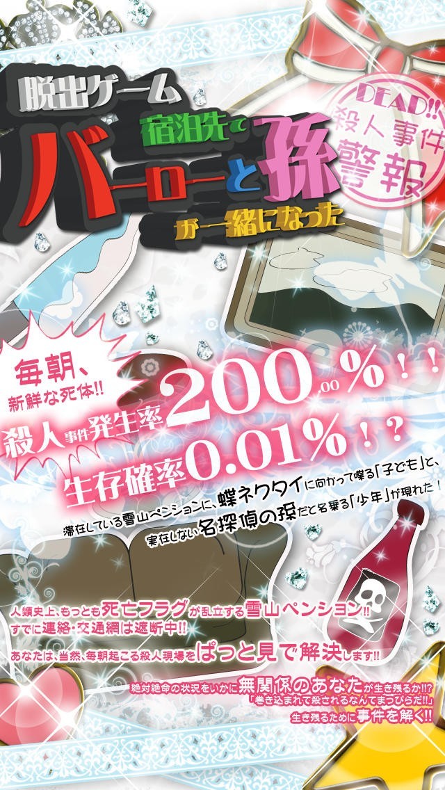 どこかで見たようなキャラクター達が活躍する「脱出ゲーム|宿泊先でバーローと孫が一緒になった」の主人公は、蝶ネクタイの少年と名探偵の孫の2人。閉じ込められたペンションから生還するために、力を合わせて事件を解決していきます。雪山ペンションのお約束が満載。脱出ものや推理ものが好きな人ならピンとくるシチュエーションのステージに、思わずクスリと笑ってしまうかもしれません。クリアランキング機能など、友達とシェアしてプレイできる機能も搭載しています!
