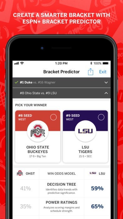 * Need an extra edge? Subscribe to ESPN+ and get access to Bracket Predictor, Bracket Analyzer, and expert analysis for game-by-game insights to help you win. Additionally, get access to thousands of live streaming events and ESPN originals on ESPN.com, ESPN App, and connected TV devices. Start a free trial inside the app to check it out.