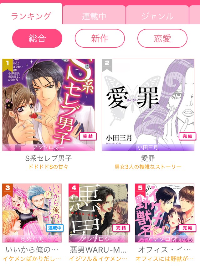 また、各ジャンルごとに人気・連載中・完結のテーマがあり、特に人気の作品はアプリ利用時にはぜひともチェックして頂きたい作品ばかりです。