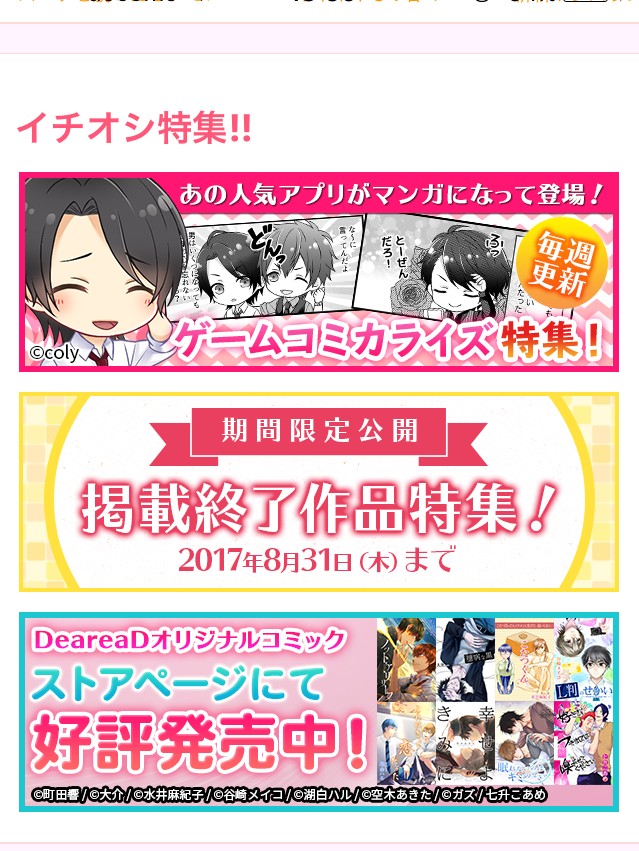 例えば、毎週更新のあるゲームコミカライズ特集や掲載終了作品特集(期間限定公開)などあります。