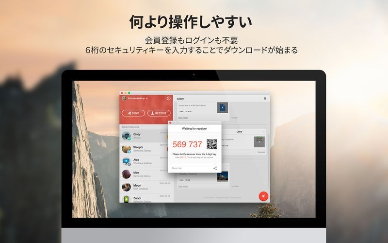 * ファイルを送信すると、相手にプッシュ通知が届き、 相手側はキーを入力する必要なく楽にファイルを受信できます。