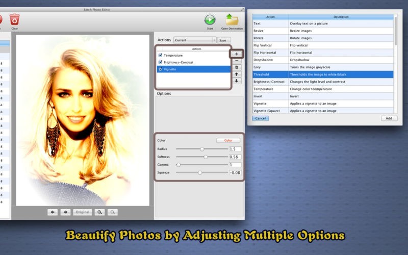 Batch Photo Editor, an easy-to-use image bulk processing app, helps you to add images and text watermarks to all your photos at a time. With Batch Photo Editor, you can resize, rotate, adjust color and add multi special effects to thousands of photos in just one click.