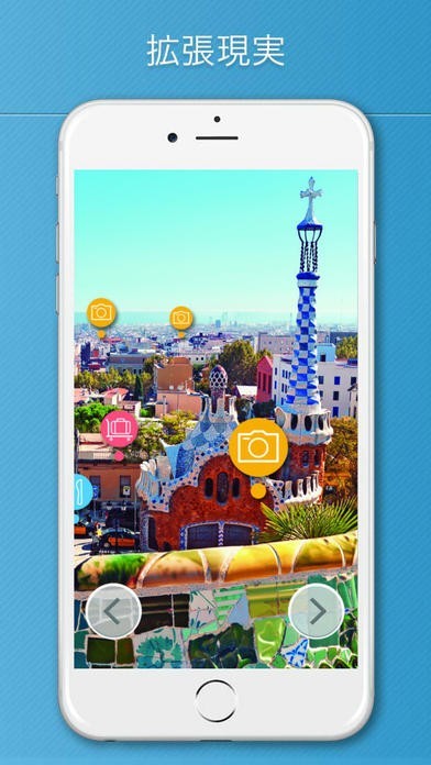 拡張現実。他の旅行ガイドとは違いこのアプリには、街を散策するのに便利なiPhone とiPadのツール(AR)が搭載されています。ARボタンをクリックし、360度回転すると、お勧めの観光スポットと行き方を表示してくれます。上下に画面をスクロールすることで、近くの観光スポットだけでなく、遠くの観光スポットも見ることが出来ます。