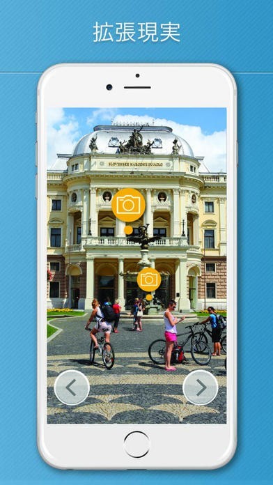 拡張現実。他の旅行ガイドとは違いこのアプリには、街を散策するのに便利なiPhone とiPadのツール(AR)が搭載されています。ARボタンをクリックし、360度回転すると、お勧めの観光スポットと行き方を表示してくれます。上下に画面をスクロールすることで、近くの観光スポットだけでなく、遠くの観光スポットも見ることが出来ます。