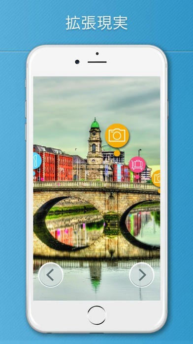 拡張現実。他の旅行ガイドとは違いこのアプリには、街を散策するのに便利なiPhone とiPadのツール(AR)が搭載されています。ARボタンをクリックし、360度回転すると、お勧めの観光スポットと行き方を表示してくれます。上下に画面をスクロールすることで、近くの観光スポットだけでなく、遠くの観光スポットも見ることが出来ます。