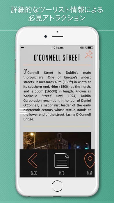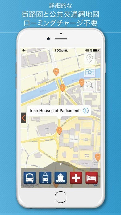 - GPS 機能 - 地図上でバス停、レストラン、パブ、ホテル、病院、美術館、劇場などを表示するインタラクティブな観光スポット