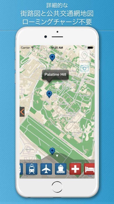 レストラン、観光名所、公共交通機関、病院といった海外旅行で知っておきたい場所が地図に表示されます。地図はズーム可能で、インタラクティブに使用できます。もちろんオフラインにも対応しています。