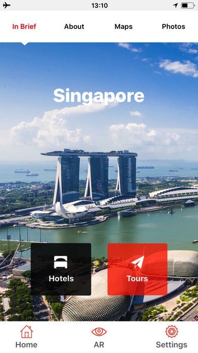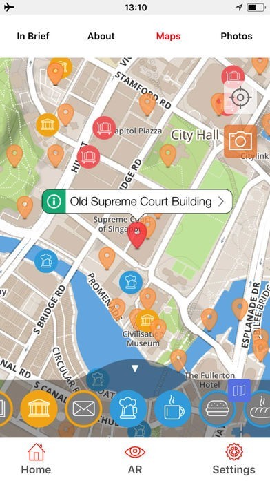 拡張現実。他の旅行ガイドとは違いこのアプリには、街を散策するのに便利なiPhone とiPadのツール(AR)が搭載されています。ARボタンをクリックし、360度回転すると、お勧めの観光スポットと行き方を表示してくれます。上下に画面をスクロールすることで、近くの観光スポットだけでなく、遠くの観光スポットも見ることが出来ます。