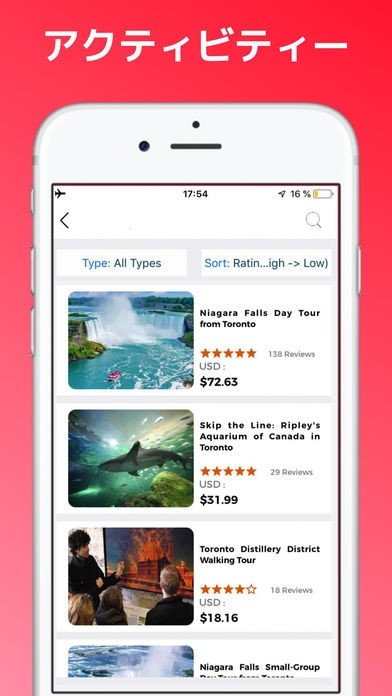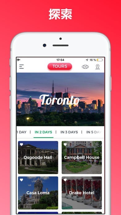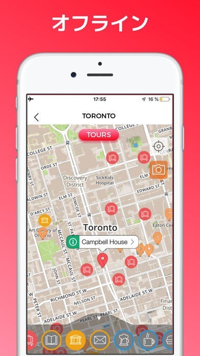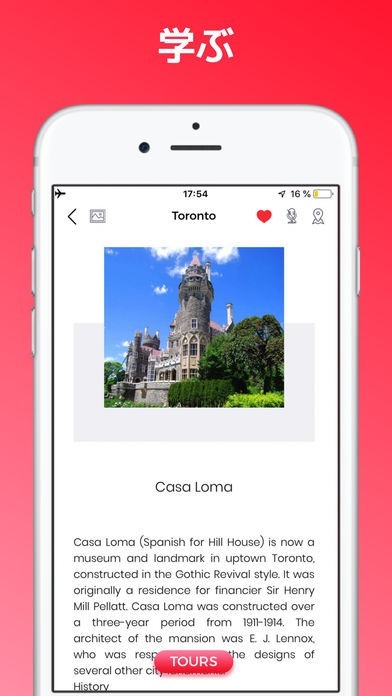 拡張現実。他の旅行ガイドとは違いこのアプリには、街を散策するのに便利なiPhone とiPadのツール(AR)が搭載されています。ARボタンをクリックし、360度回転すると、お勧めの観光スポットと行き方を表示してくれます。上下に画面をスクロールすることで、近くの観光スポットだけでなく、遠くの観光スポットも見ることが出来ます。