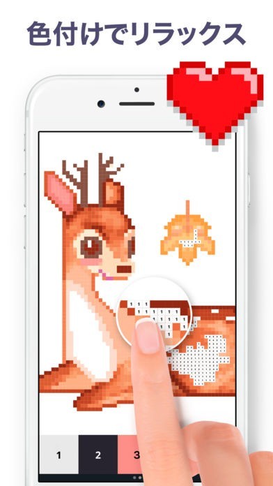 PixelArtは、数字には塗る色が決まっています。数字のマスをどんどん塗っていくぬりえです。ぬりえでリラックスしたいときに便利です。選択できる絵の種類が多く、簡単なものから大作に挑戦できるものまで揃っています。