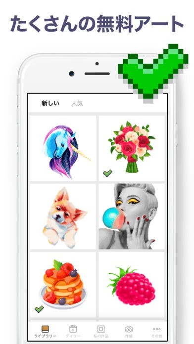 PixelArtは、数字には塗る色が決まっており、数字のマスをどんどん塗っていくぬりえです。ぬりえでリラックスしたいときに便利です。選択できる絵の種類が多く、簡単なものから大作に挑戦できるものまで揃っています。絵の下段には、カラーパレットが表示されます。色には数字が付いているので、タップで選んで同じ数字を塗り潰します。迷わずきれいに塗れるので、素敵な仕上がりになります。虫眼鏡機能があります。塗る際には長押しして拡大すると数字が見やすくなります。引いていくと色の付き具合がわかりやすく、絵画の様な仕上がりが期待できます。暇つぶしになり、完成した時には達成感が得られます。