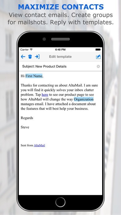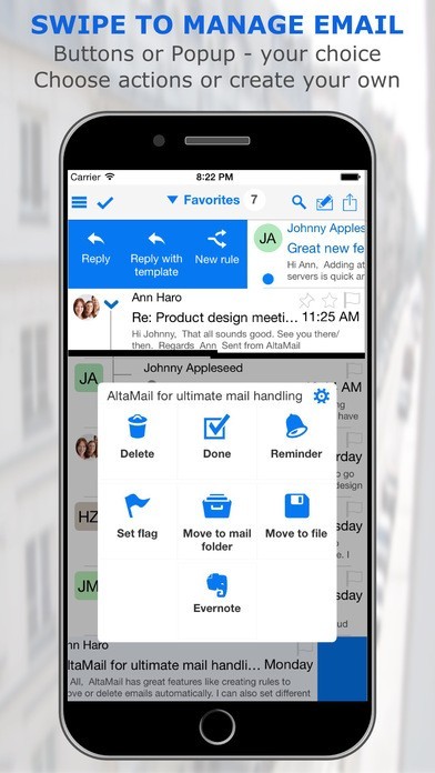 App Storeより引用「受信ボックスを空」にしたいならAltaMail™。ほぼすべてのメールアカウントに対応した究極のアプリです。メールへのアクションを先延ばしにするのではなく、その場で簡単に「処理」できるのはApp Store の中でもAltaMail だけ。AltaMail ではサッとスワイプするだけで、後で処理するメールを整理できるだけなく、マージテンプレートを使って瞬時に返答したり、その場でルールを作成してメールが自動で整理されるようにすることができます。