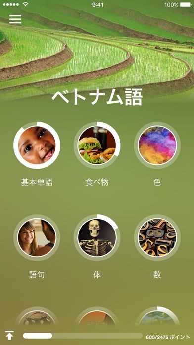 • ビジュアル – 美しい画像で単語とイメージを結び付け、脳の学習を加速させます。視覚を使って新しい言語の記憶を助けます。
