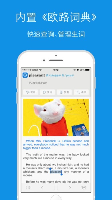 - 与拥有海量词库的《欧路词典》无缝集成,查词典、背单词轻松搞定。