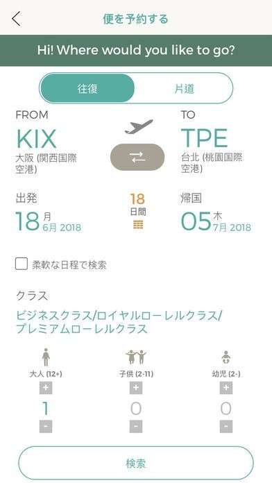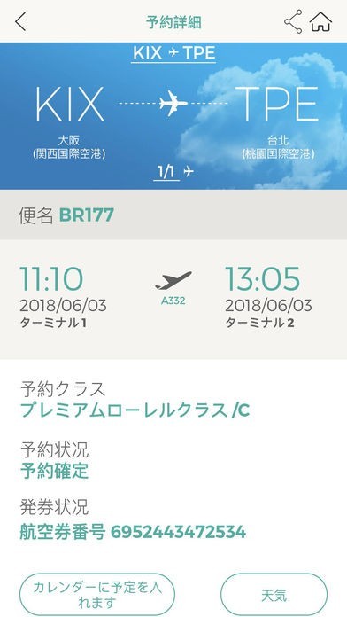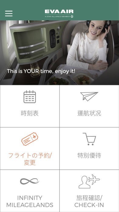 EVA Mobileでは、エバー航空の飛行機の予約から購入、予約した席の種類の変更などが可能で、機内食の選択やオンラインチェックインなどもできるようになっています。