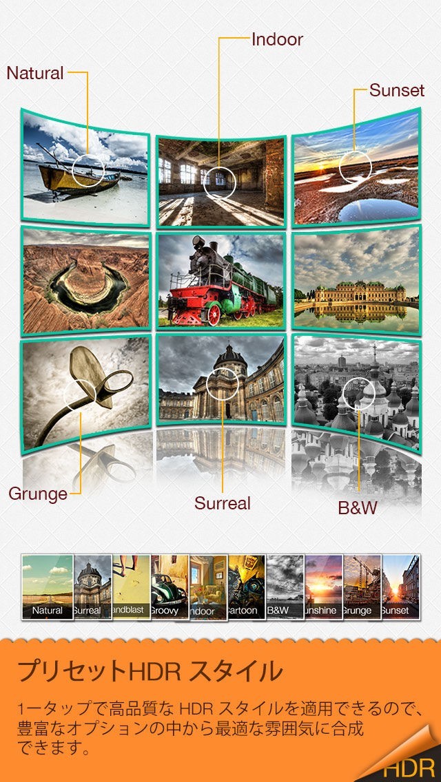 シンプルに操作できるインターフェイスを用意しており、迫力満点の写真を手軽に撮影できるのが特徴です。HDRプリセットを利用することで、ワンタップで写真にさまざまな合成や加工を加えることができます。