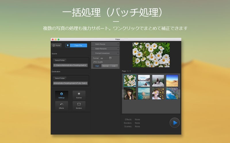 一括処理はワンクリックでシーン、エフェクト、および罫線を適用でき、サイズ、名前、ファイル形式をすばやく変換できます。