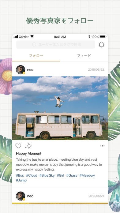 写真撮影から、加工までトータルで行えるアプリになっております。加工のバリエーションは豊富で、数あるフィルターを使うことで、まるで映画のワンシーンのような仕上がりにすることもできます。コラージュのテンプレートも豊富で、組み合わせ方も自由なのでSNSなどにアップする時にも重宝します。写真コンテストも開催されているので、自信がある写真を投稿しても楽しいです。