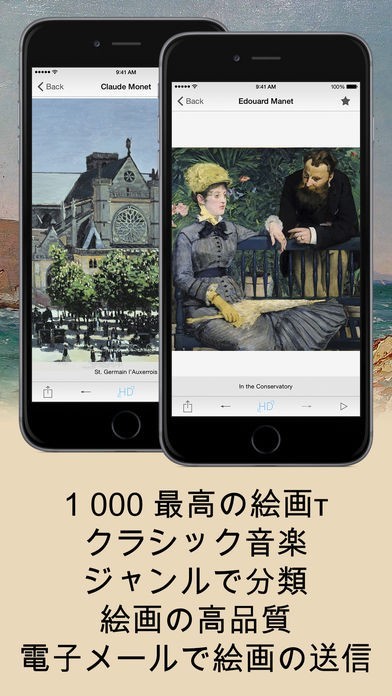 まるで美術館か博物館にいるような豊富な絵画コレクションが楽しめます。シャガールやモネなど有名な画家を始め、古代から現代までの西洋画家による風景画、静物画、肖像画、歴史画、戦争画、風俗画など18ジャンルもの絵をHDの高画質で楽しめます。
