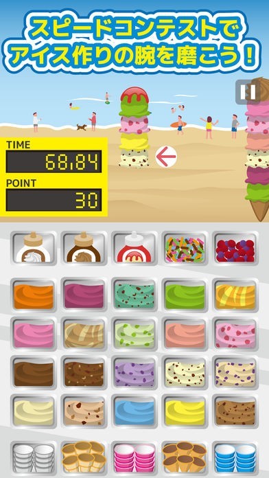 ●ミニゲームのスピードコンテストでは、70秒の制限時間内にどれだけアイスクリームを作ることができるかを腕試しできます。
