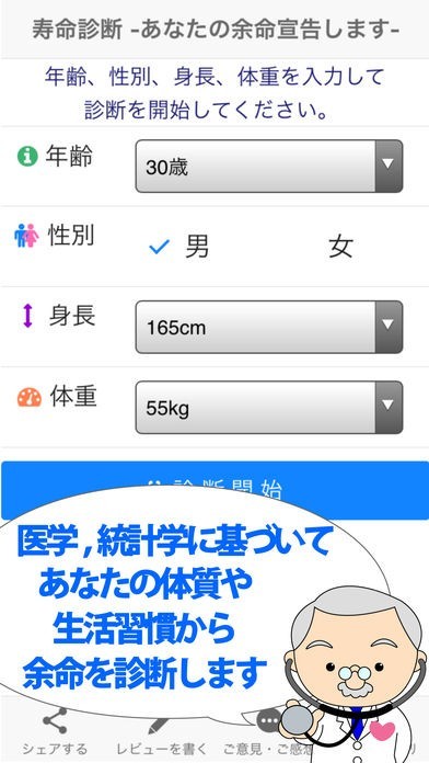人間なら誰しも一度は、自分の余命があと何年なのか、気になったことがあるかと思います。このアプリはそんなあなたの余命を、簡単な入力といくつかの質問に答えるだけで診断してくれます。使い方は簡単。年齢、性別、体重などを入力し、あとは「タバコを一日に何本吸いますか?」などの質問に四択から答えていくだけ。すると、あなたの推定余命を教えてくれ、さらにその結果に応じた、余命を延ばすためのアドバイスも貰えます。そのアドバイスを元に生活習慣を見直すと、長生き出来るかもしれません。一人でもじゅうぶん楽しめますが、友達や家族とやってみると、盛り上がることは間違いないでしょう。