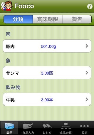 食べ物でも飲料や肉、野菜といったものごとに初期仕分けできます。そのため材料名ごとに探さなくても自然に整理され、残っている飲料や肉などを把握して余り材料を使った料理を作れます。