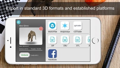 Export your model directly to platforms like SketchFab, Google Poly, i.materialise, Shapeways and CGTrader. Models can be exported in a variety of formats for use in other 3D tools – OBJ, STL, USDZ, GLB (Binary glTF), PLY, X3D. Share your models with friends through Facebook, Twitter, Instagram, WhatsApp, Email and SMS, even as an animated GIF.