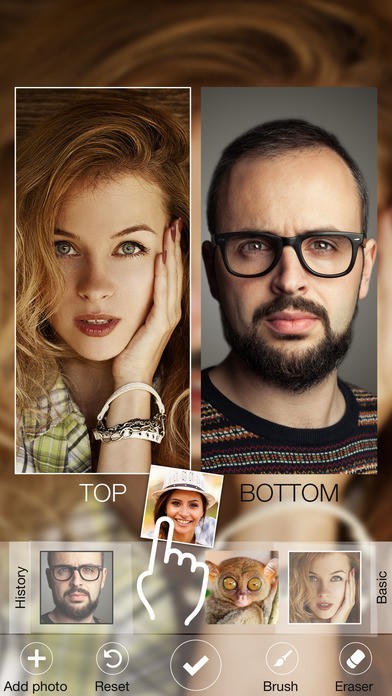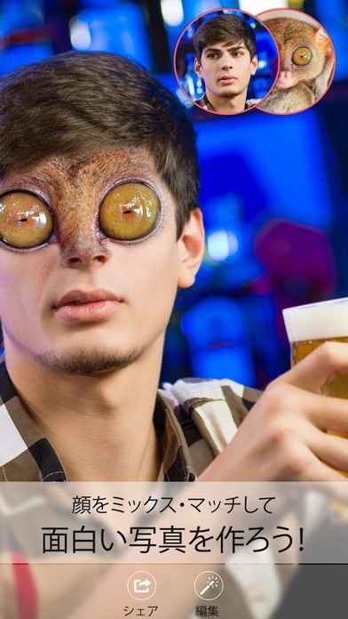 App Storeより引用Face Replace はあなたの顔を他の写真と組み合わせて独自の面白い作品を作ります。新しい写真を撮るか、Facebookからの写真を自由に組み合わせることができます。友達とあなたの最高の顔を共有しましょう!