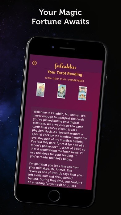 Faladdin offers individual analyses about life by combining its deep learning skills and ancient knowledge of mystical disciplines like Tarot, Astrology, Clairvoyance and Coffee Cup Reading.