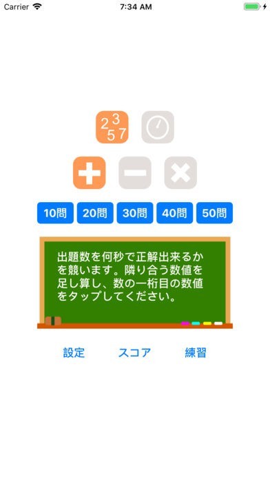 選択した問題数を全て解き終わるまでの時間を計測するタイムアタックモードと制限時間内に何問の問題を解き終えたかを競うタイマーモードの2種類のゲームモードから好きなモードを選んでプレイすることができます。