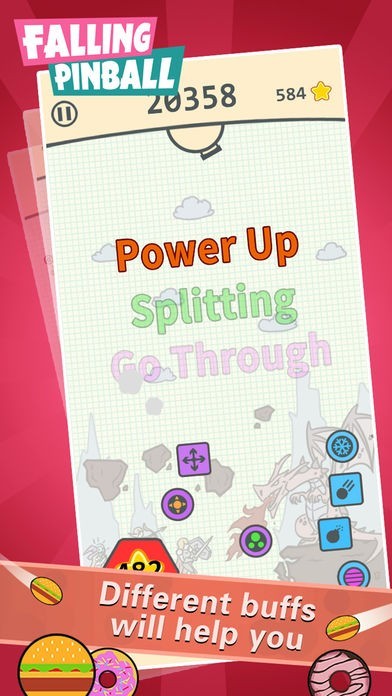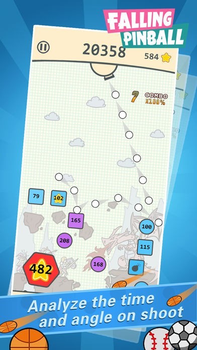 レンガがチェックラインに到着する前に壊すこと。指を動かしボールを狙い、レンガの間で回転させる。ピンボールはノンストップシューティングゲーム。スペシャルレンガに当たればbuffを獲得できますが見えないレンガに気を付けてね。狙う時物理学をよく使ってね!